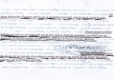 « Des hommes, des femmes, comme des fossiles, se mêlent aux souffles des galops dans la plaine, aux cavalcades, aux ruts, aux éboulis, aux écoulements. Emportés par les vagues, par la pluie, en continents dérivés, au bout de la terre, suspendus à la roche, accrochés à la nuit, des hommes, des femmes reprennent haleine. Comme des animaux dans la grotte de Lascaux, ils tricotent des rêves dans des matières terreuses, fouettent l'œil de beautés obscures qu'ils déposent sur des murs aux savoirs brûlants. Leurs gestes lents imitent le temps qui fait pousser les poils, les os, les organes. Leurs gestes lents démusèlent, dé-musclent, amusent l'intérieur des corps, débusquent les désirs qui les dévorent. Des hommes, des femmes aux fameuses parties de jambes sous la terre s'emboîtent les os, les cuisses, les dos, élargissent l'espace des peaux. Ils dévoilent sous les pans de robes aux dessins dénoués, des couronnes, des taureaux, des tornades. »