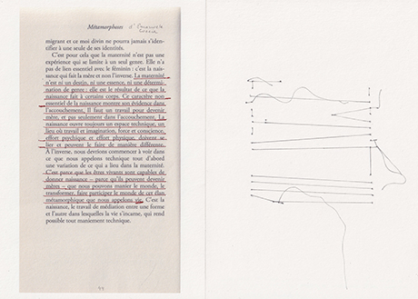 Soulignage (Marie-José Mondzain), embroidered paper on print and pencil on paper, 22 × 31 cm, 2024