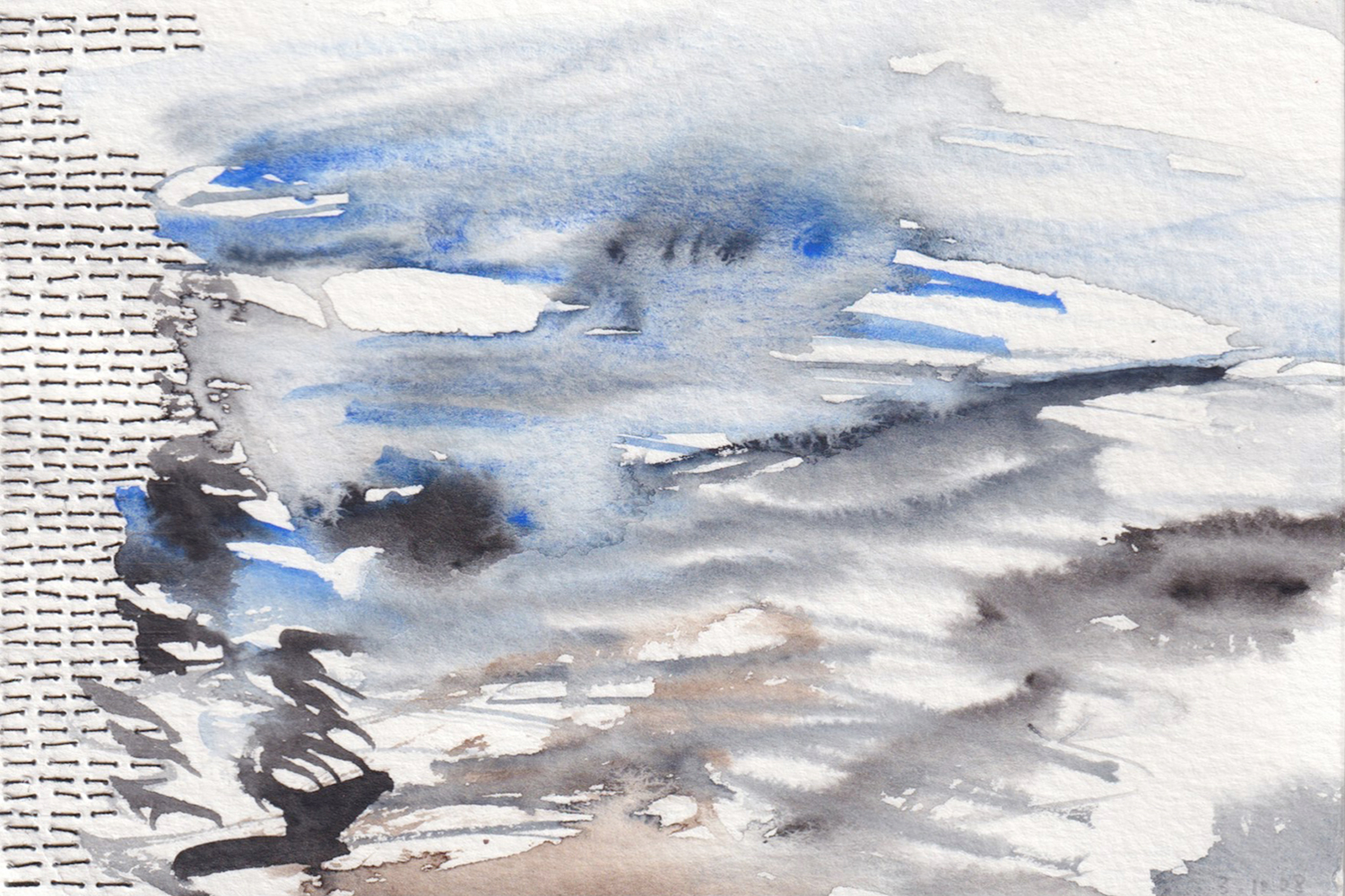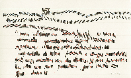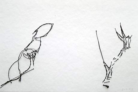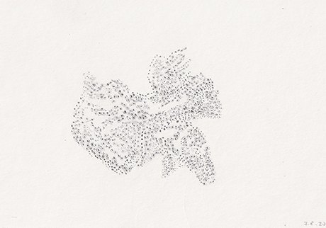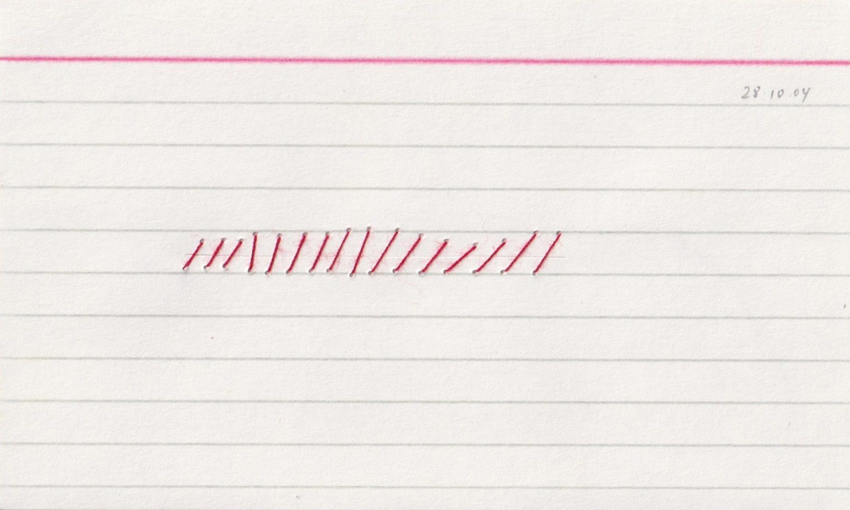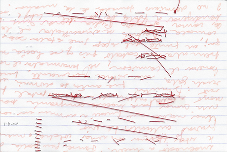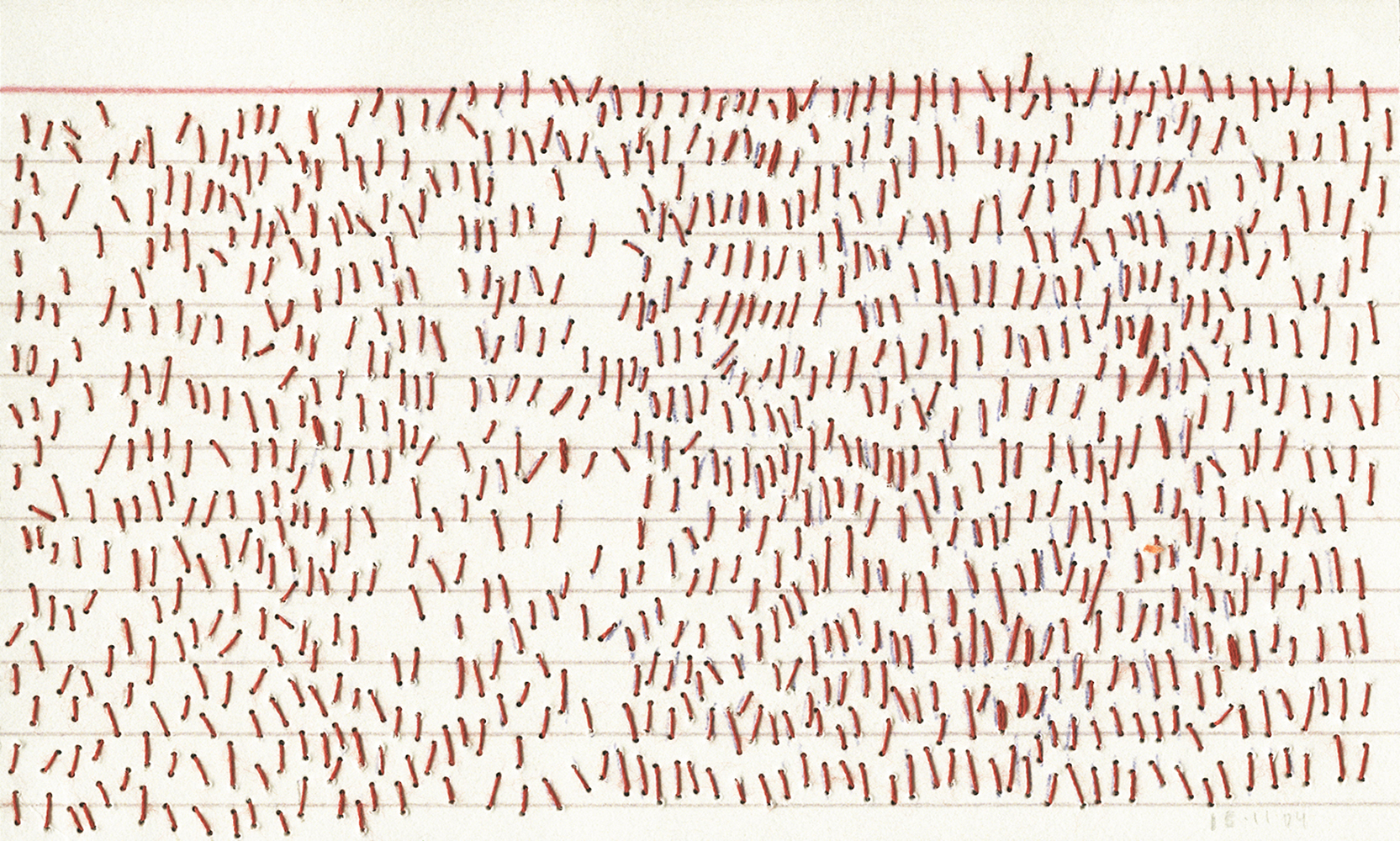 Ongoing project since 2003 / Nearly daily graphic notations / A form of intimate journal / Done in various supports from lined index cards to plastic sleeves including diverse papers and fabrics, canvas, etc / Size: 7.6 × 12.7 cm and 10 × 15 cm / Dated / Mixed media: pencil, pen, watercolor, thread, adhesive tape, photographs / Incised, perforated, embroidered, crocheted, sewn, cut, wet, caressed material / Use of Spanish, English and French words / Integrated by more than one thousand drawings contained in metal drawers.