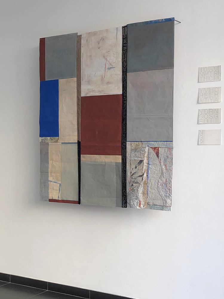Ensemble errant, oil painting on hand-sewn paper and crocheted text, 130 × 110 cm, 2022
