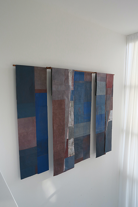 The work is constructed from debris of materials and with fragments of rice paper drawn, painted and sewn by hand. It evokes the idea of ​​transformation and recalls the structure and origin of the Kesa, a garment worn by Zen Buddhist monks and nuns during meditation. In La surface du vent, the air of the space where the work is installed gives it a subtle movement, like breathing, which is now part of it