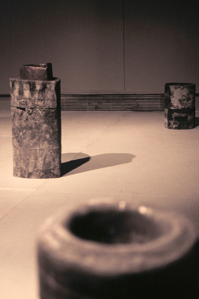 Precarious Bodies, wood, clay, and sound, variable dimensions, average object size 46 × 15.3 × 12.7 cm, 1999